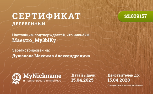Nickname Maestro_My3blKy is registered to Dushakov Maxim Alexandrovich. Issued certificate ID1829157. Issue date 15.04.2025.