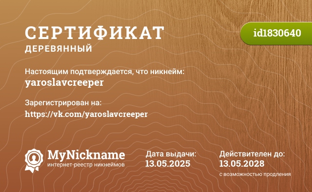 Nickname yaroslavcreeper is registered to https://vk.com/yaroslavcreeper. Issued Wooden certificate ID1830640. Issue date 13.05.2025.