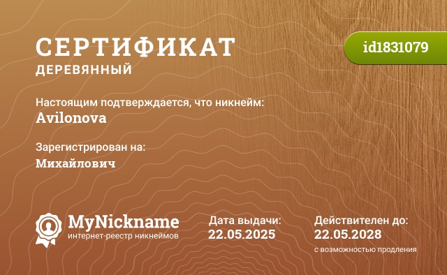 Nickname Avilonova is registered to Mikhailovich . Issued Wooden certificate ID1831079. Issue date 22.05.2025.