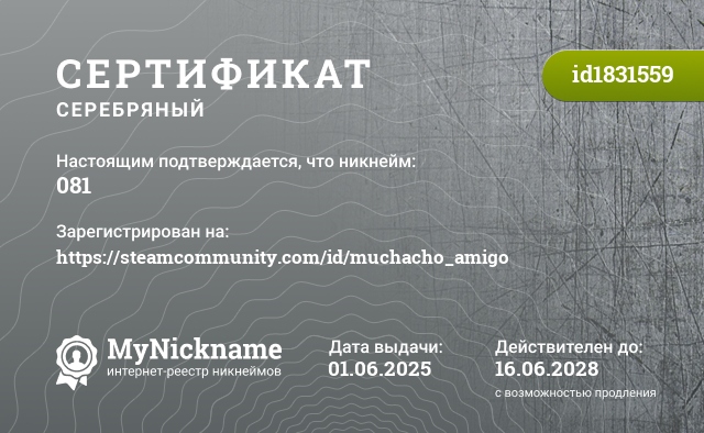 certificate for nickname: 081 (id1831559)