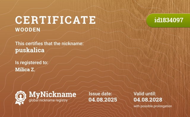 Nickname puskalica is registered to Milica Z.. Issued certificate ID1834097. Issue date 04.08.2025.