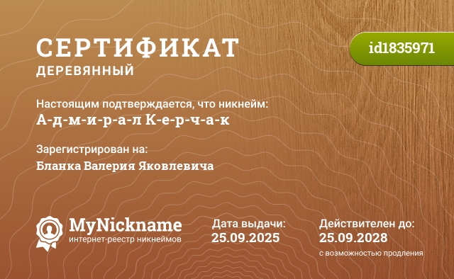 Nickname А-д-м-и-р-а-л К-е-р-ч-а-к is registered to Blanka Valery Yakovlevich. Issued certificate ID1835971. Issue date 25.09.2025.