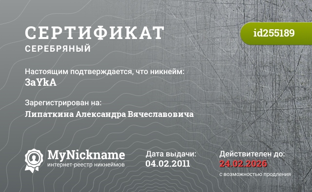 Nickname 3aYkA is registered to Lipatkin Alexander Vyacheslavovich. Issued certificate ID255189. Issue date 04.02.2011.