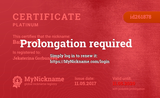 Nickname Bamboocha is registered to Jekaterina Gorbunova. Issued certificate ID261878. Issue date 11.05.2017.