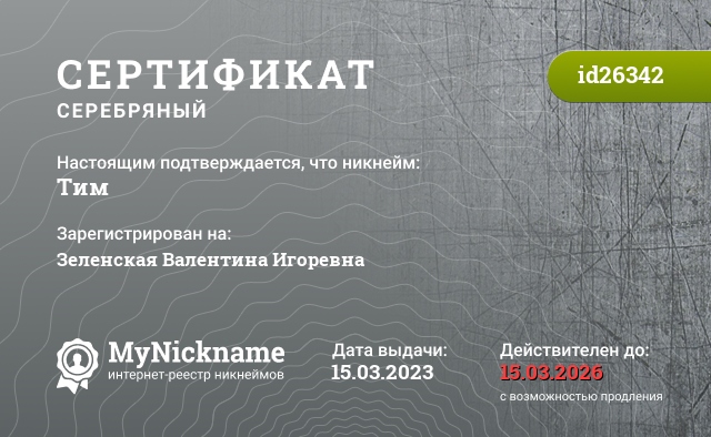 Certificate for nickname Тим is registered to: Zelenskaya Valentina Igorevna