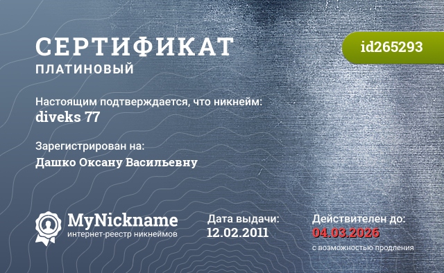 Nickname diveks 77 is registered to Dashko to Oksana Vasilievna. Issued certificate ID265293. Issue date 12.02.2011.