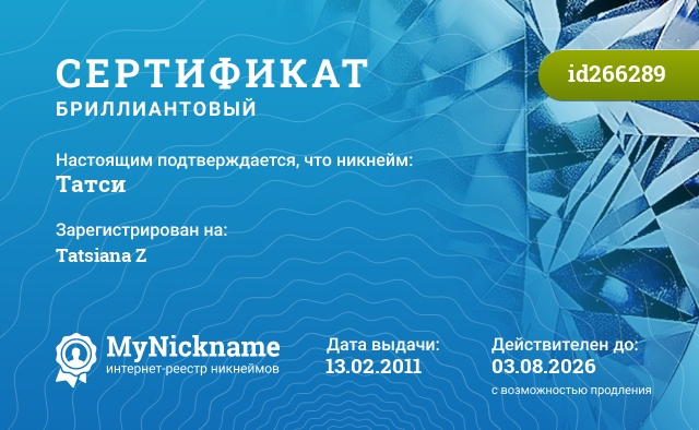 Nickname Татси is registered to Tatsiana Z. Issued Diamond certificate ID266289. Issue date 13.02.2011.