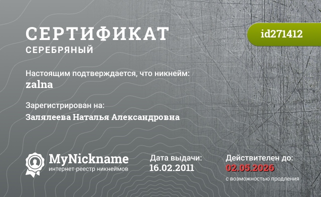 Nickname zalna is registered to Zalyaleeva Natalia Alexandrovna. Issued certificate ID271412. Issue date 16.02.2011.