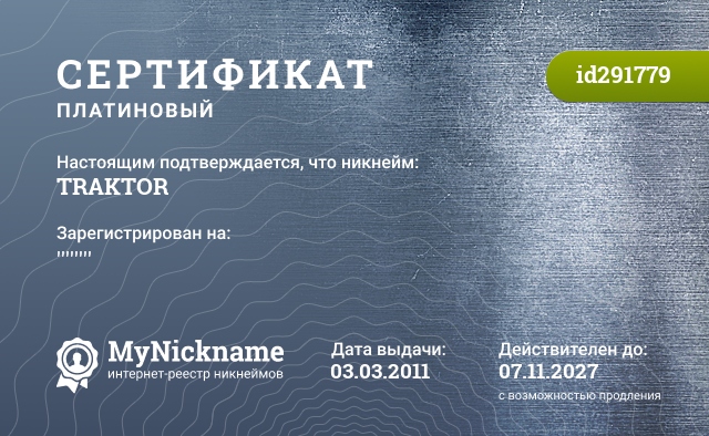 Nickname TRAKTOR is registered to ''''''''. Issued certificate ID291779. Issue date 03.03.2011.