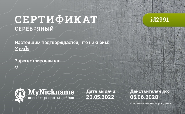 Nickname Zash is registered to IN. Issued certificate ID2991. Issue date 20.05.2022.