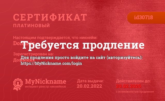 Nickname Dominic is registered to Dominic. Issued certificate ID30718. Issue date 20.02.2022.