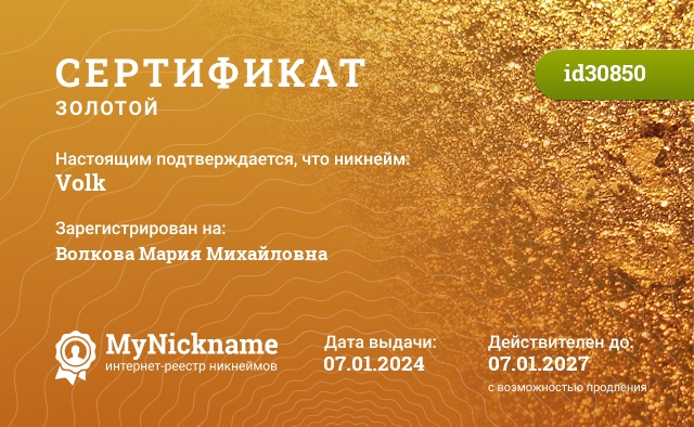 Nickname Volk is registered to Volkova Maria Mikhailovna. Issued Gold certificate ID30850. Issue date 07.01.2024.