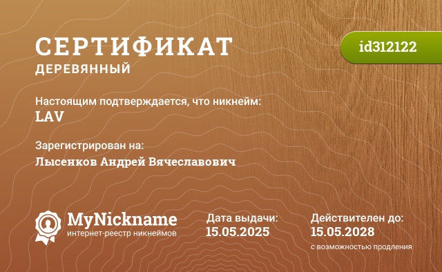 Nickname LAV is registered to Lysenkov Andrey Vyacheslavovich. Issued certificate ID312122. Issue date 15.05.2025.