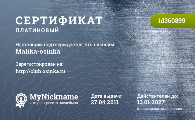 Nickname Malika-osinka is registered to http://club.osinka.ru. Issued certificate ID360899. Issue date 27.04.2011.