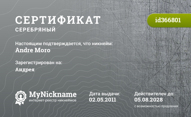 Nickname Andre Moro is registered to Andrey. Issued Silver certificate ID366801. Issue date 02.05.2011.