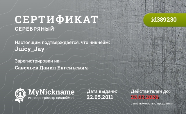 Nickname Juicy_Jay is registered to Savelyev Danil Evgenievich. Issued certificate ID389230. Issue date 22.05.2011.