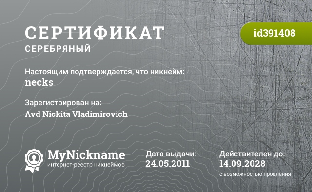 Nickname necks is registered to Avd Nickita Vladimirovich. Issued Silver certificate ID391408. Issue date 24.05.2011.