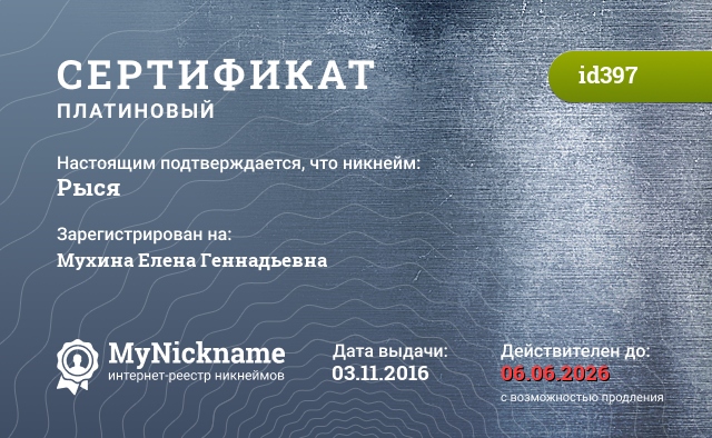 Nickname Рыся is registered to Mukhina Elena Gennadievna. Issued certificate ID397. Issue date 03.11.2016.