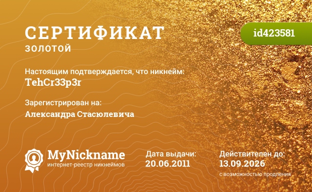 Nickname TehCr33p3r is registered to Alexander Stasyulevich. Issued certificate ID423581. Issue date 20.06.2011.