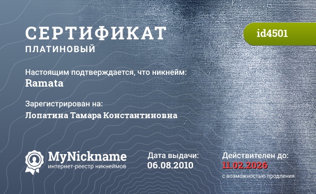 Nickname Ramata is registered to Lopatina Tamara Konstantinovna. Issued certificate ID4501. Issue date 06.08.2010.
