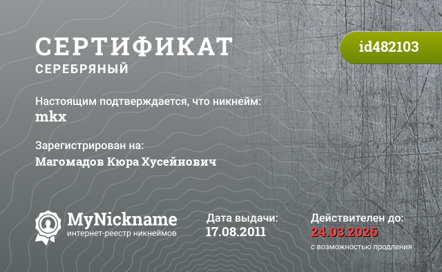 Nickname mkx is registered to Kyura Huseynovych Magomadov. Issued certificate ID482103. Issue date 17.08.2011.