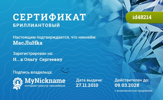Nickname MacJluHka is registered to N...to Olga Sergeevna. Issued Diamond certificate ID48214. Issue date 27.11.2010.