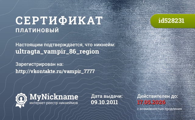 Nickname ultragta_vampir_86_region is registered to http://vkontakte.ru/vampir_7777. Issued Platinum certificate ID528231. Issue date 09.10.2011.
