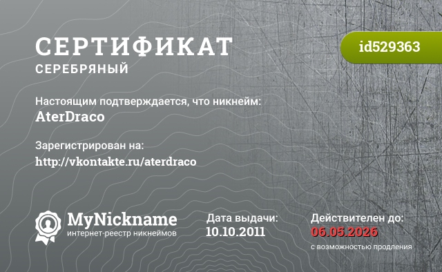 Nickname AterDraco is registered to http://vkontakte.ru/aterdraco. Issued certificate ID529363. Issue date 10.10.2011.