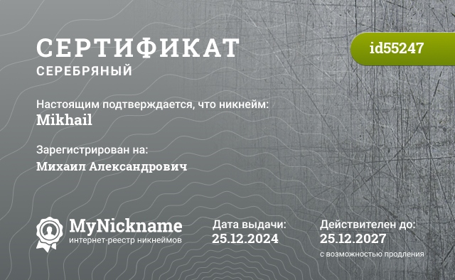 Nickname Mikhail is registered to Mikhail Alexandrovich. Issued certificate ID55247. Issue date 25.12.2024.