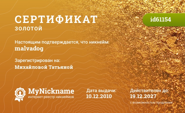 Nickname malvadog is registered to Mikhailova Tatyana. Issued certificate ID61154. Issue date 10.12.2010.