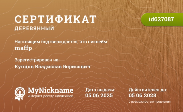Nickname maffp is registered to Kuptsov Vladislav Borisovich. Issued certificate ID627087. Issue date 05.06.2025.