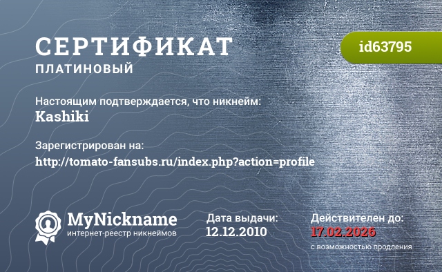 Nickname Kashiki is registered to http://tomato-fansubs.ru/index.php?action=profile. Issued certificate ID63795. Issue date 12.12.2010.