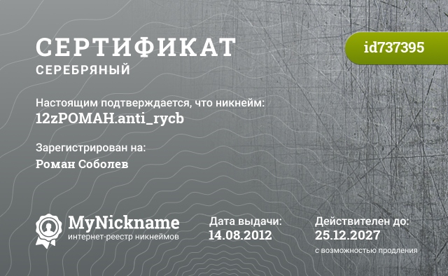 Nickname 12zPOMAH.anti_rycb is registered to Roman Sobolev. Issued Silver certificate ID737395. Issue date 14.08.2012.