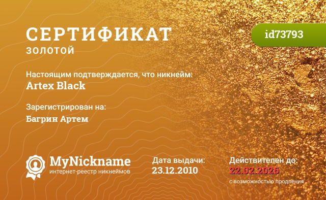 Nickname Artex Black is registered to Bagrin Artem. Issued certificate ID73793. Issue date 23.12.2010.