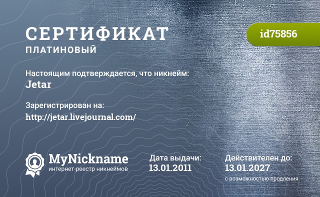 Nickname Jetar is registered to http://jetar.livejournal.com/. Issued certificate ID75856. Issue date 13.01.2011.
