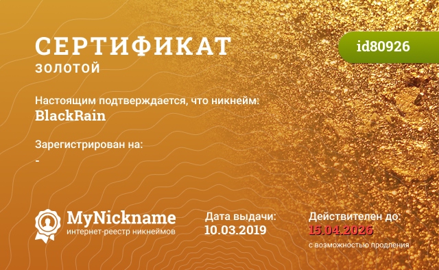 Nickname BlackRain is registered to -. Issued certificate ID80926. Issue date 10.03.2019.
