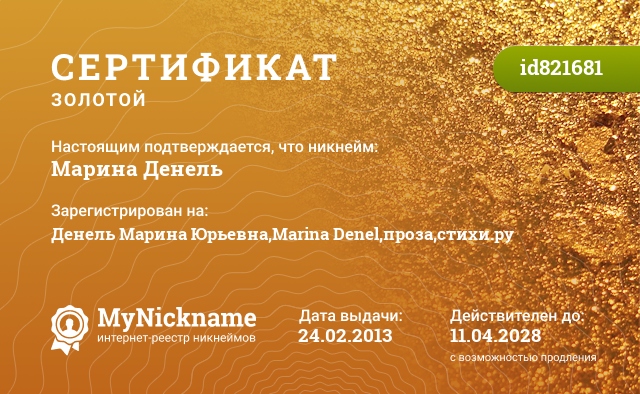 Nickname Марина Денель is registered to Denel Marina Yurievna, Marina Denel, prose, poetry. Issued certificate ID821681. Issue date 24.02.2013.