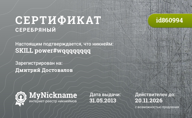 Nickname SKILL power#wqqqqqqqq is registered to Dmitry Dostovalov. Issued certificate ID860994. Issue date 31.05.2013.