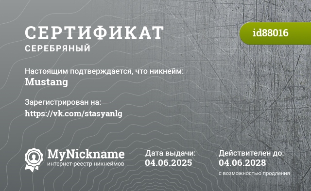 Nickname Mustang is registered to https://vk.com/stasyanlg. Issued certificate ID88016. Issue date 04.06.2025.