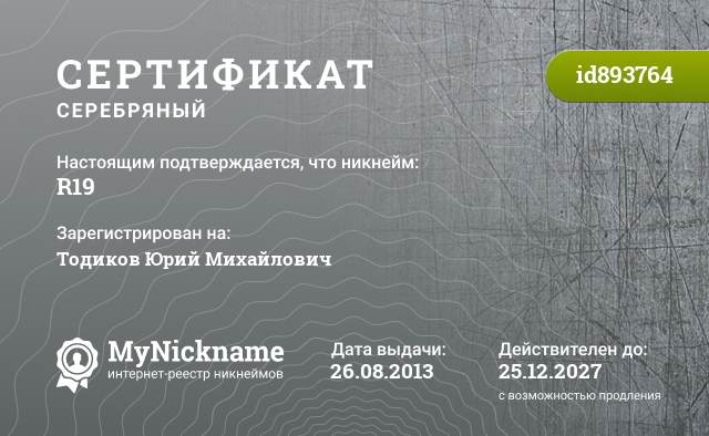 Nickname R19 is registered to Todikov Yuri Mikhailovich. Issued certificate ID893764. Issue date 26.08.2013.