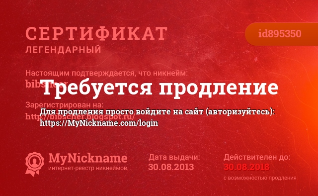 Nickname bibshcer is registered to http://bibscher.blogspot.ru/. Issued Legendary certificate ID895350. Issue date 30.08.2013.
