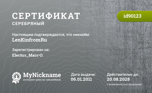 Nickname LenKinfromRu is registered to Chosen_Mars•O. Issued certificate ID90123. Issue date 06.01.2011.