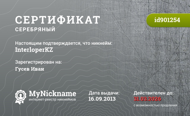 Nickname InterloperKZ is registered to Gusev Ivan. Issued certificate ID901254. Issue date 16.09.2013.