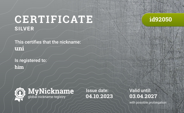 Nickname uni is registered to him. Issued certificate ID92050. Issue date 04.10.2023.