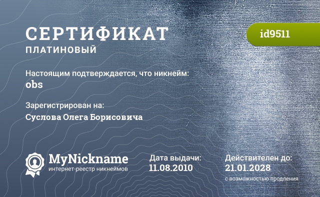 Certificate for nickname obs is registered to: Suslov Oleg Borisovich