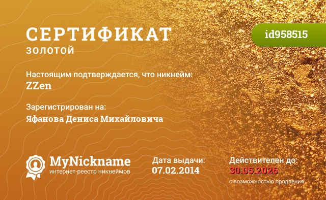 Nickname ZZen is registered to Yafanov Denis Mikhailovich. Issued certificate ID958515. Issue date 07.02.2014.