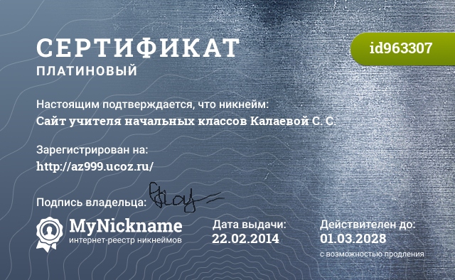 certificate for nickname: Сайт учителя начальных классов Калаевой С. С. (id963307)