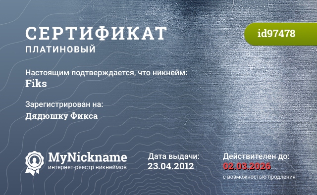certificate for nickname: Fiks (id97478)