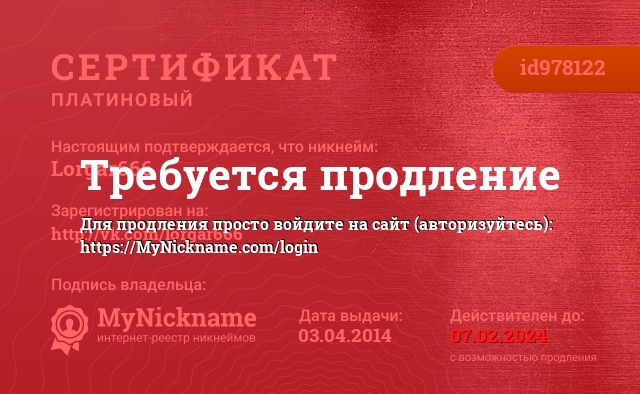 Nickname Lorgar666 is registered to http://vk.com/lorgar666. Issued certificate ID978122. Issue date 03.04.2014.