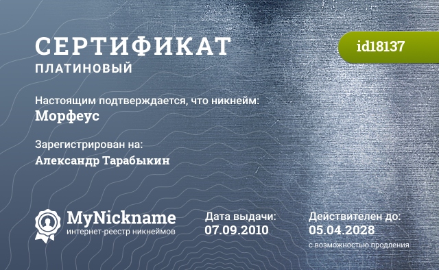 Nickname Морфеус is registered to Alexander Tarabykin. Issued certificate ID18137. Issue date 07.09.2010.